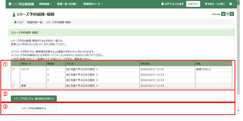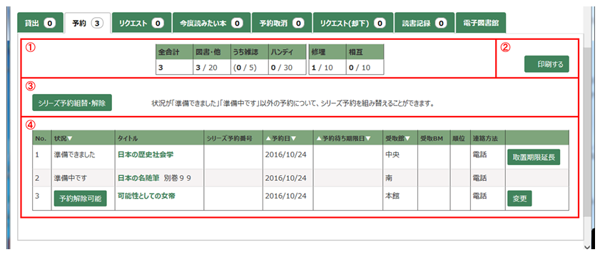 ※既に状況が「準備できました」「準備中です」になっている予約は一覧に挙がりません。(ただし、シリーズ予約の一部だけ準備できている場合は、一覧に挙がります。)