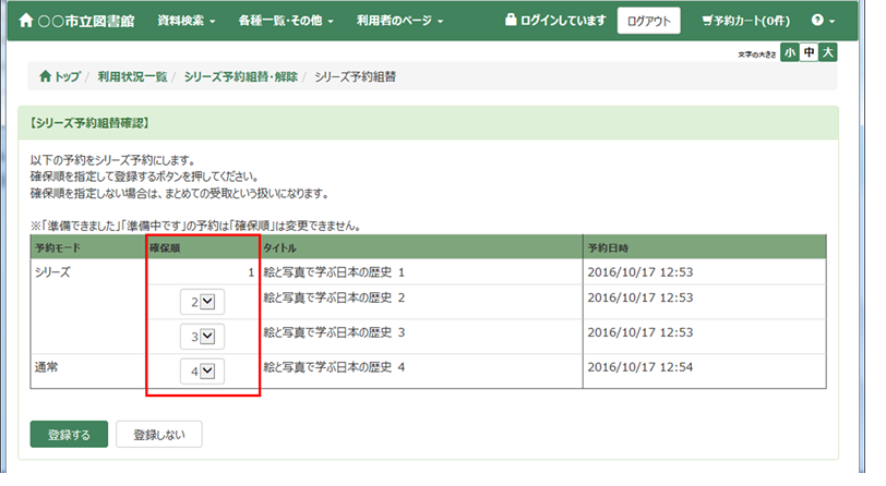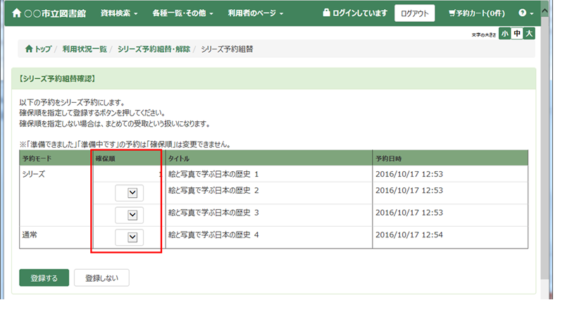 確保順を指定して登録するボタンを押します。ボタンを押すと、登録処理が実行され、予約一覧画面に戻ります。