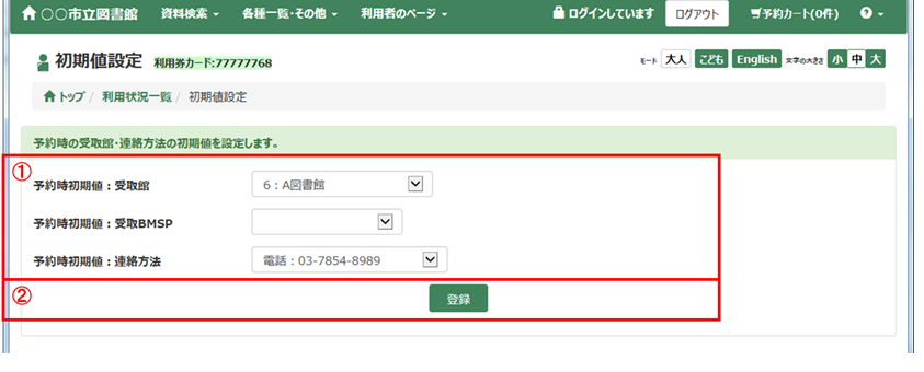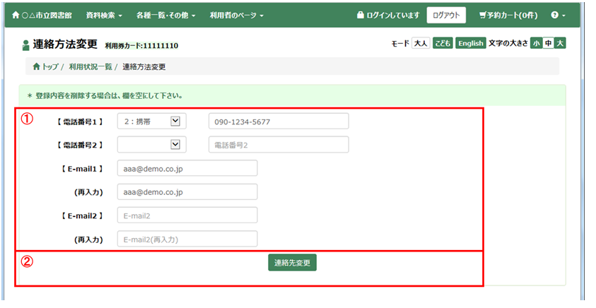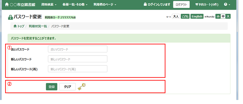 利用者のページでは、利用者個人の貸出状況・予約状況の参照、パスワードの変更や連絡先の変更ができます。