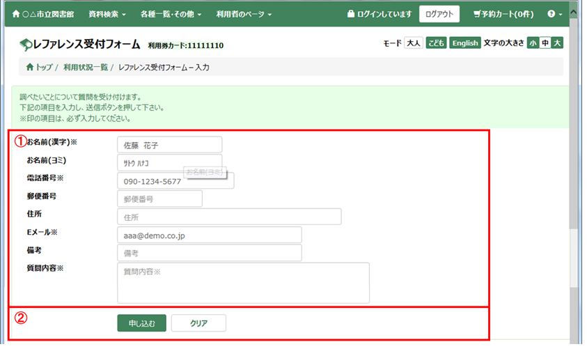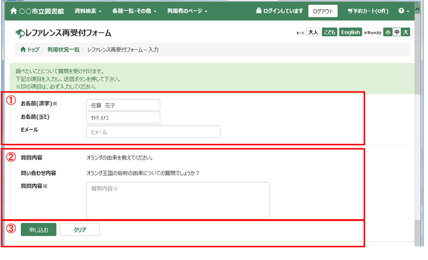 レファレンスの質問を図書館に送信することができます。