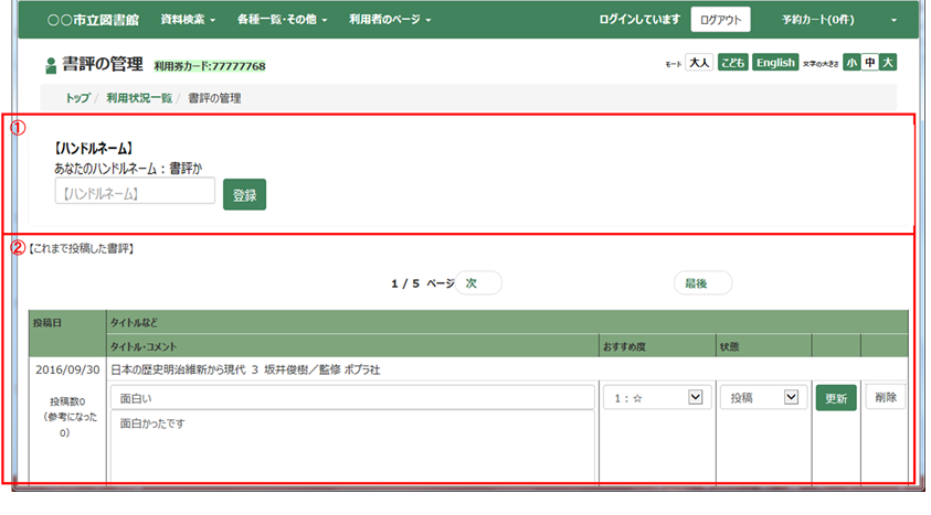自分の投稿した書評の確認、変更、削除をすることができます。