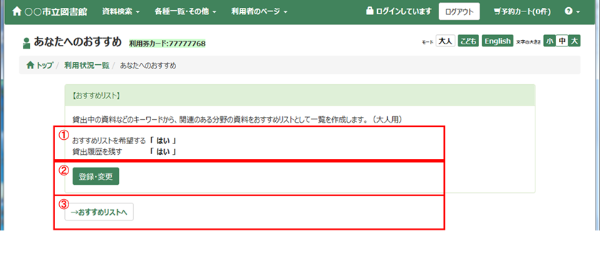 「いいえ」にすると、今まで貸出した資料の情報を破棄し、以後、おすすめリストの基礎資料の対象ではなくなります。