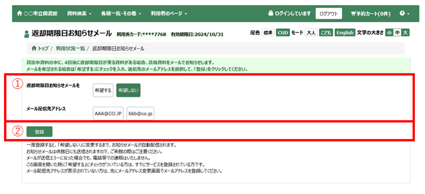 返却期限日の数日前にお知らせメールを受け取るかどうかを登録することができます。